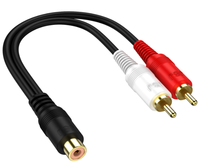 Y Adapter splitter cable with 1 RCA Female to 2 RCA Male plug stereo audio adapter extension cord connectors.